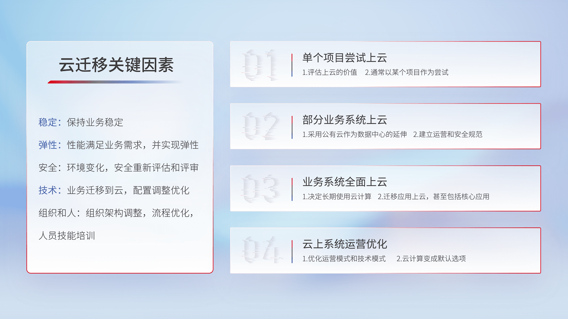 结合实际业务,,从规划设计、、、、云平台选型、、云原生改造、、数据迁移、、、、集成交付,,迁移全过程为客户识别最佳上云路径,,做好风险识别管理,,,,设计网络架构、、身份权限、、安全审计合规、、、操作审计、、、日志审计、、、、监控告警策略、、、、多站点容灾设计等,,,,对云上基础设施进行整体规划,,,,提升IT治理水平,,以满足弹性、、、、高可用、、、、高性能的需求。。。。