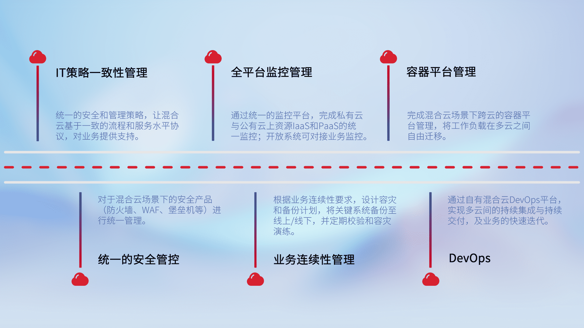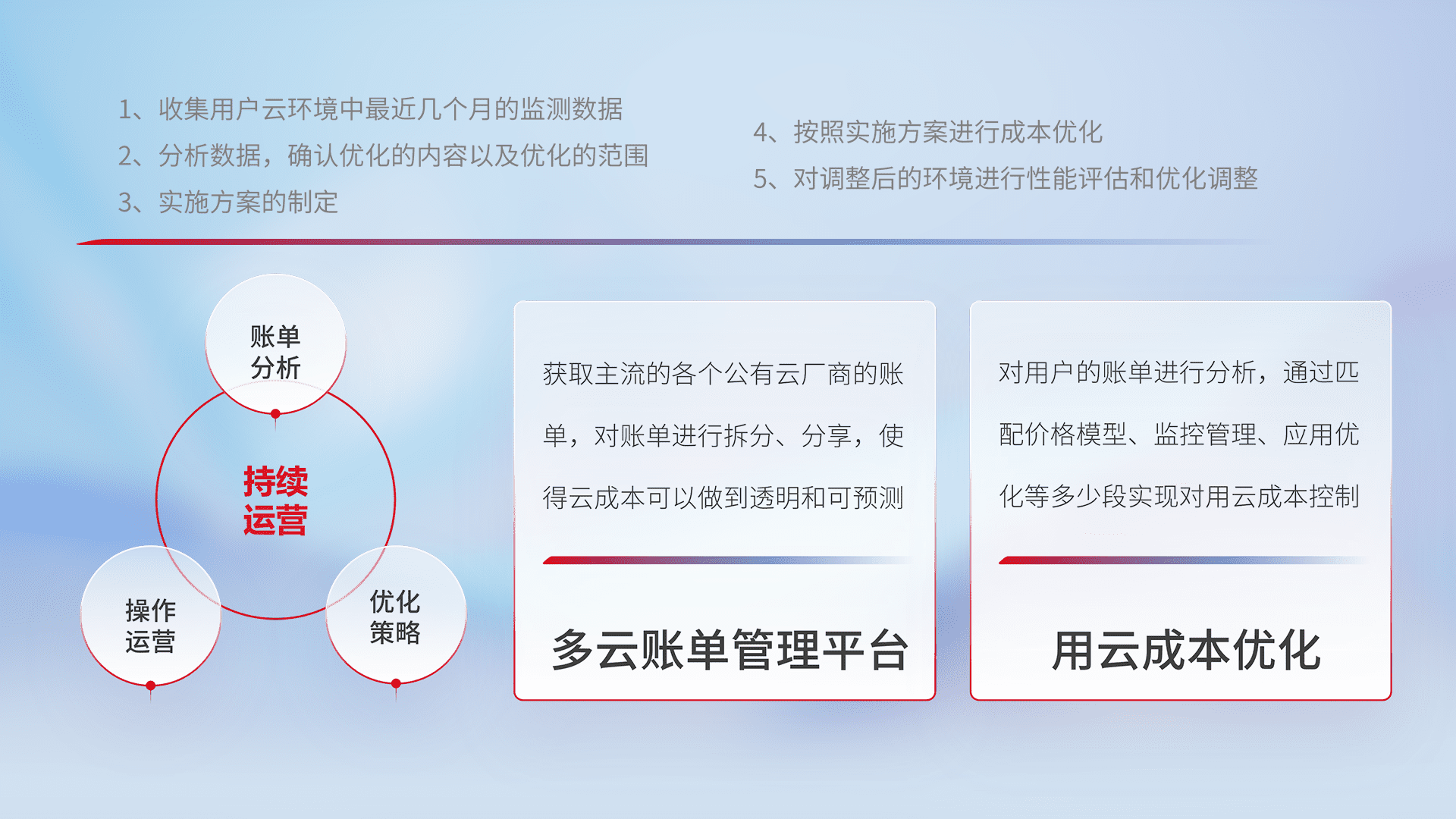 通过多云纳管,,以统一的资源数据模型把客户的云资源进行抽象和封装,,进而实现对多云资源的统一操作,,,,保障云资源管理的可靠性、、、、稳定性与可用性。。量身定制化运维内容,,,配置、、开发运维、、、补丁管理、、、、备份、、、监控、、、认证和访问管理、、、审计和日常巡检等,,,保障在用云过程中的可靠度,,,,稳定度以及高可用率。。