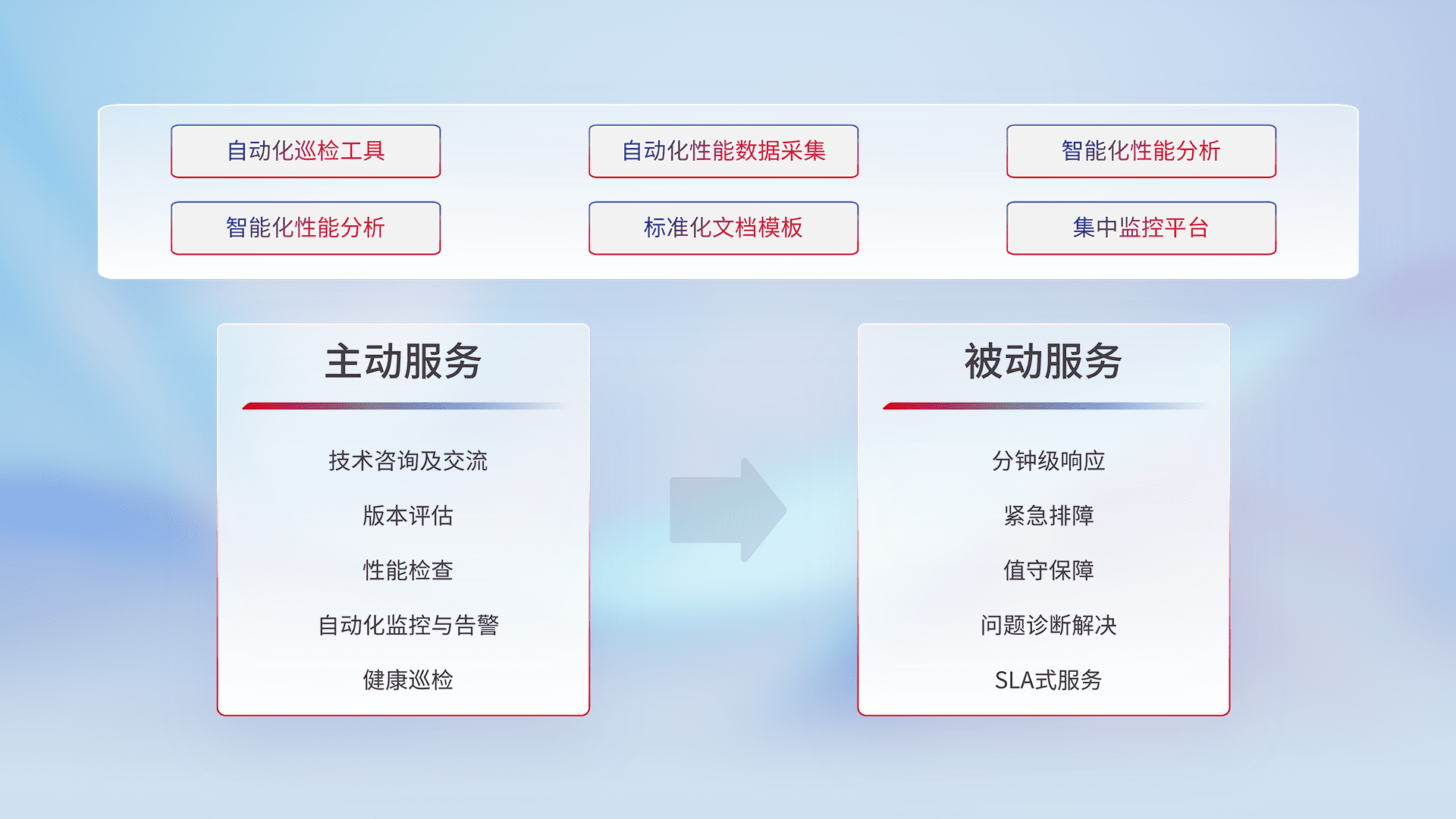 智能化工具和标准化文档,,保障服务质量,,,提供主动服务(包含技术咨询、、、、版本评估、、性能检查、、、、自动化监控与告警、、、健康巡检)和被动服务包含(分钟级响应、、、紧急排障、、、值守保障、、、、问题诊断解决、、、SLA服务)。。